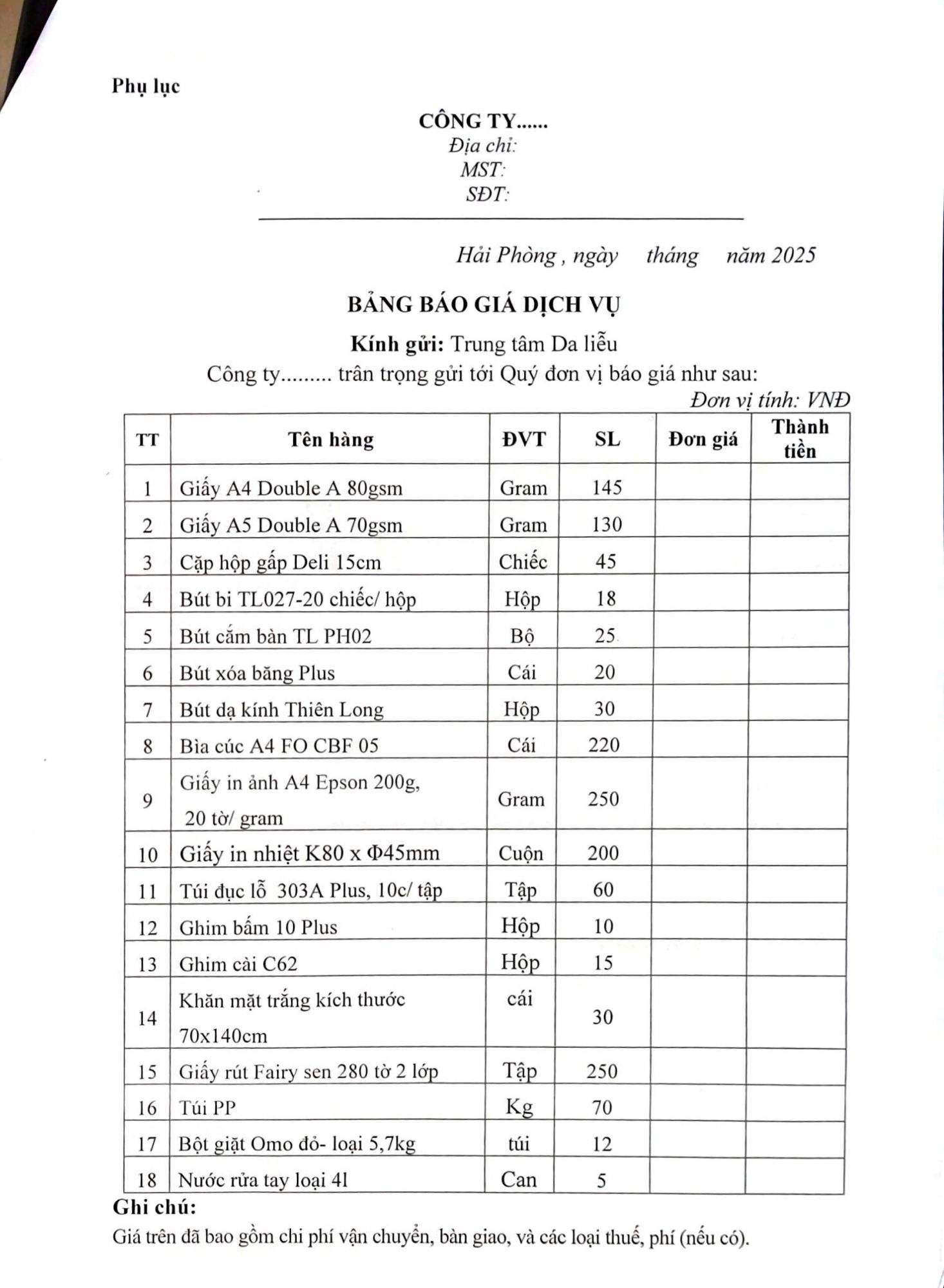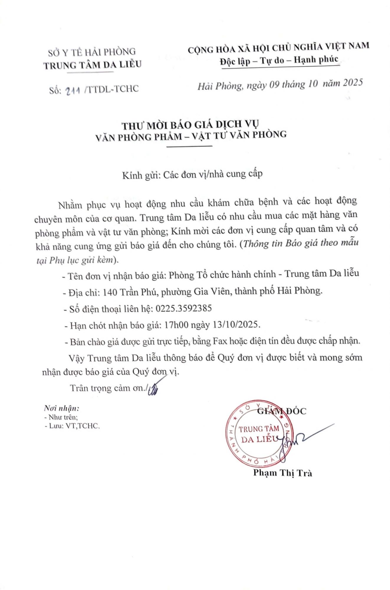 Thứ 5, 09/10/2025 | 15:25 A- A A+ | Thư mời báo giá dịch vụ văn phòng phẩm - vật tư văn phòng Đọc bài Lưu Tác giả: BAN BIÊN TẬP Nguồn:Trung tâm da liễu Hải Phòng Copy link Tổng số điểm của bài viết là: 0 trong 0 đánh giá Click để đánh giá bài viết