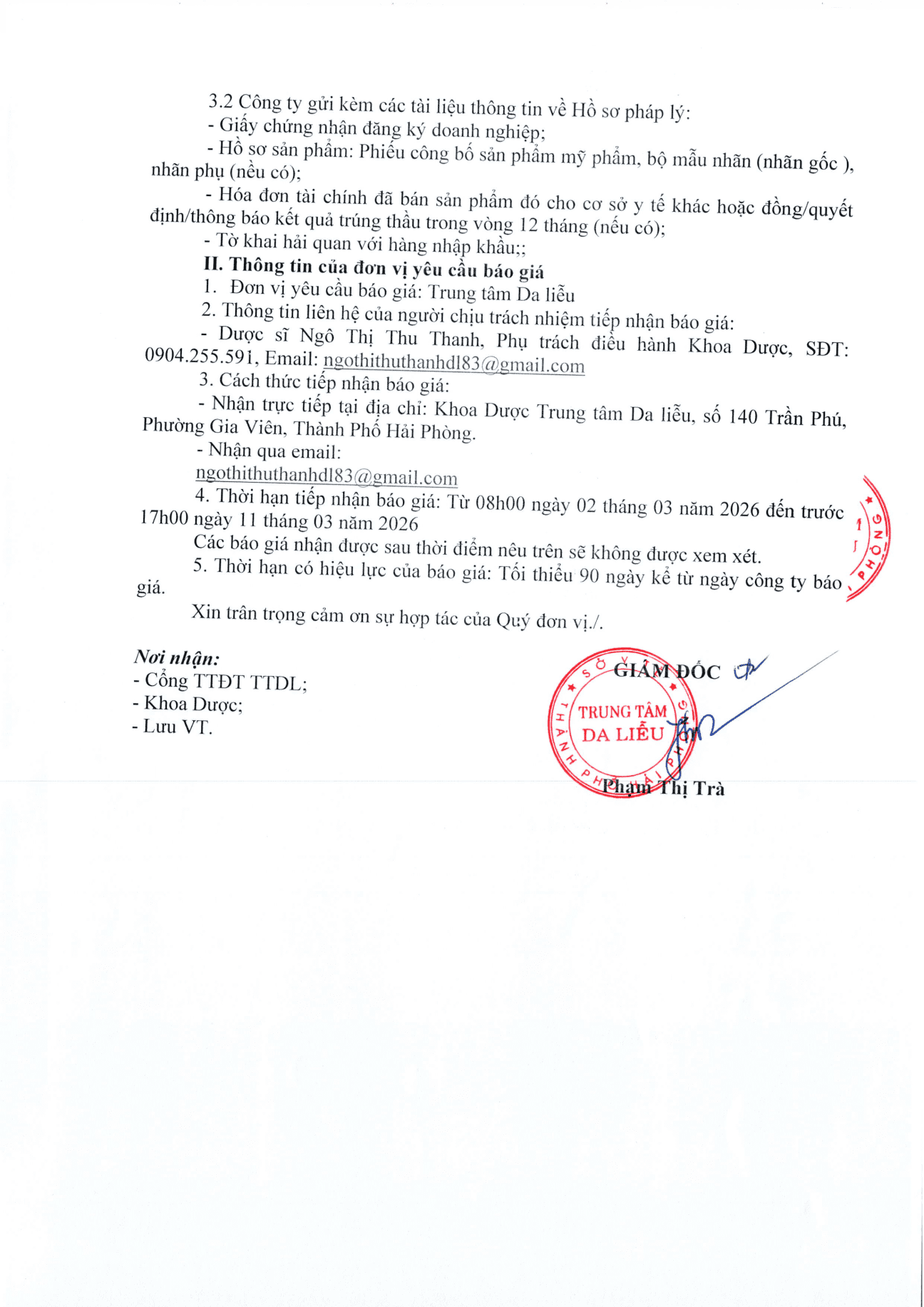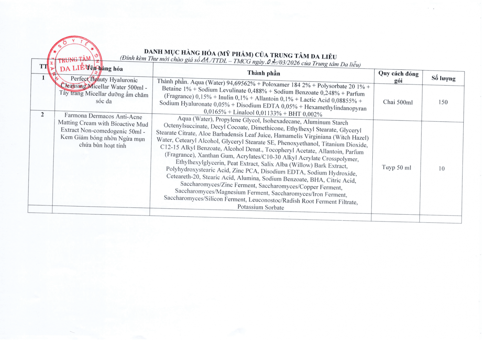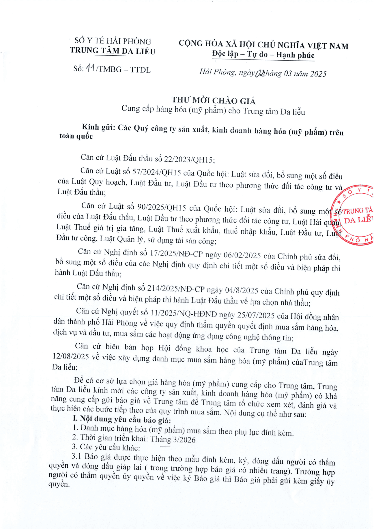 Thứ 2, 02/03/2026 | 17:01 A- A A+ | Thư mời chào giá cung cấp hàng hóa (mỹ phẩm) cho Trung tâm Da liễu Đọc bài Lưu Tác giả: BAN BIÊN TẬP Nguồn:Trung tâm da liễu Hải Phòng Copy link Tổng số điểm của bài viết là: 0 trong 0 đánh giá Click để đánh giá bài viết
