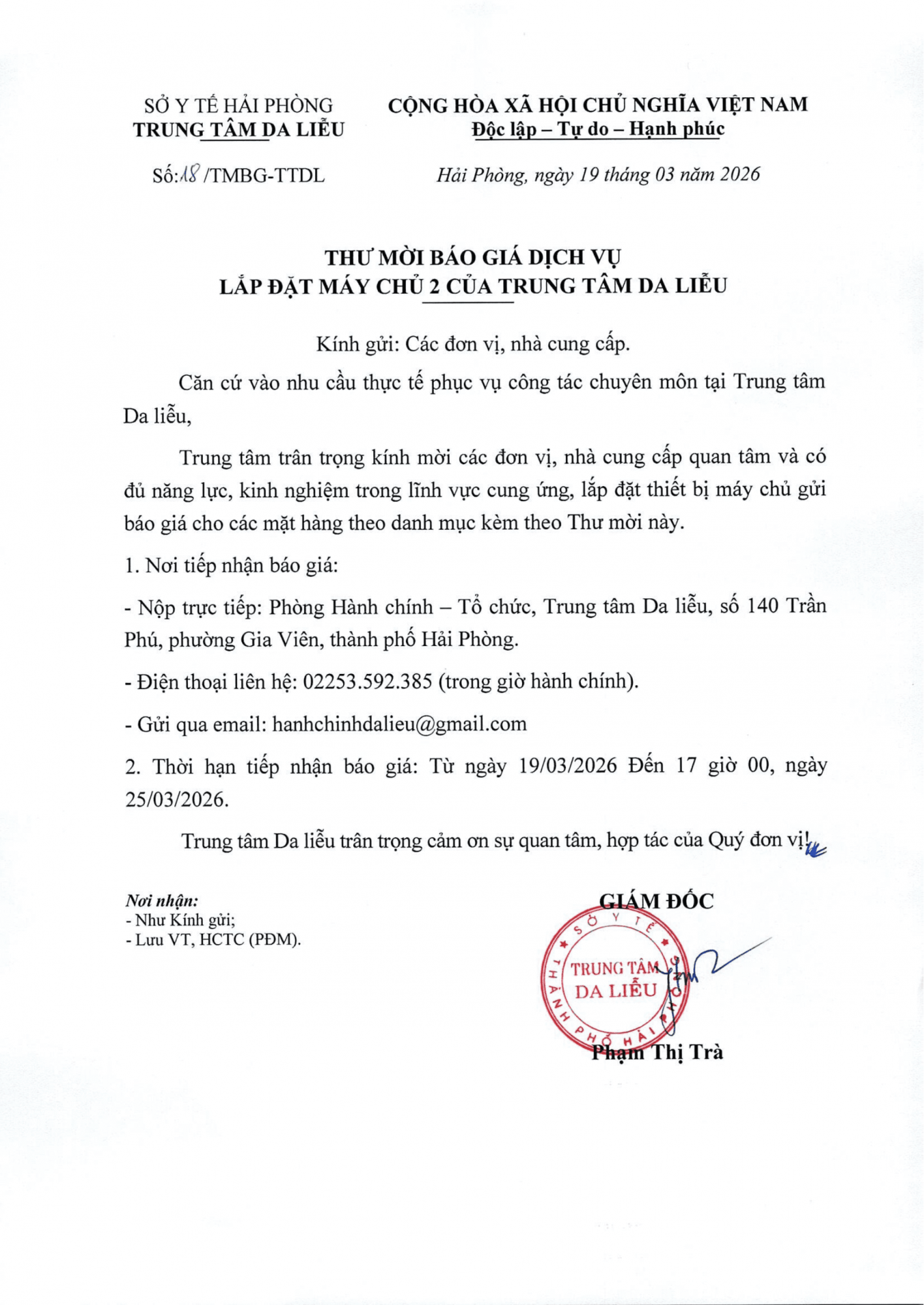Thứ 5, 19/03/2026 | 15:44 A- A A+ | V/v báo giá dịch vụ Lắp đặt Máy chủ 2 của Trung tâm Da liễu Đọc bài Lưu Tác giả: BAN BIÊN TẬP Nguồn:Trung tâm da liễu Hải Phòng Copy link Tổng số điểm của bài viết là: 0 trong 0 đánh giá Click để đánh giá bài viết