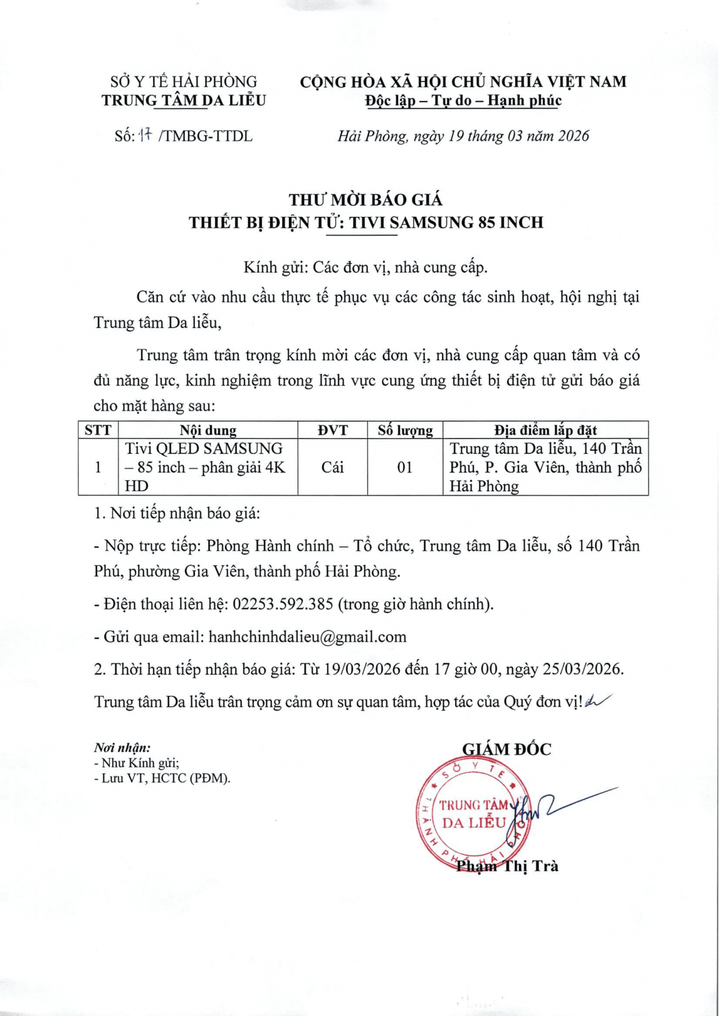 Thứ 5, 19/03/2026 | 15:43 A- A A+ | V/v báo giá Thiết bị điện tử: Tivi Samsung 85 inch Đọc bài Lưu Tác giả: BAN BIÊN TẬP Nguồn:Trung tâm da liễu Hải Phòng Copy link Tổng số điểm của bài viết là: 0 trong 0 đánh giá Click để đánh giá bài viết