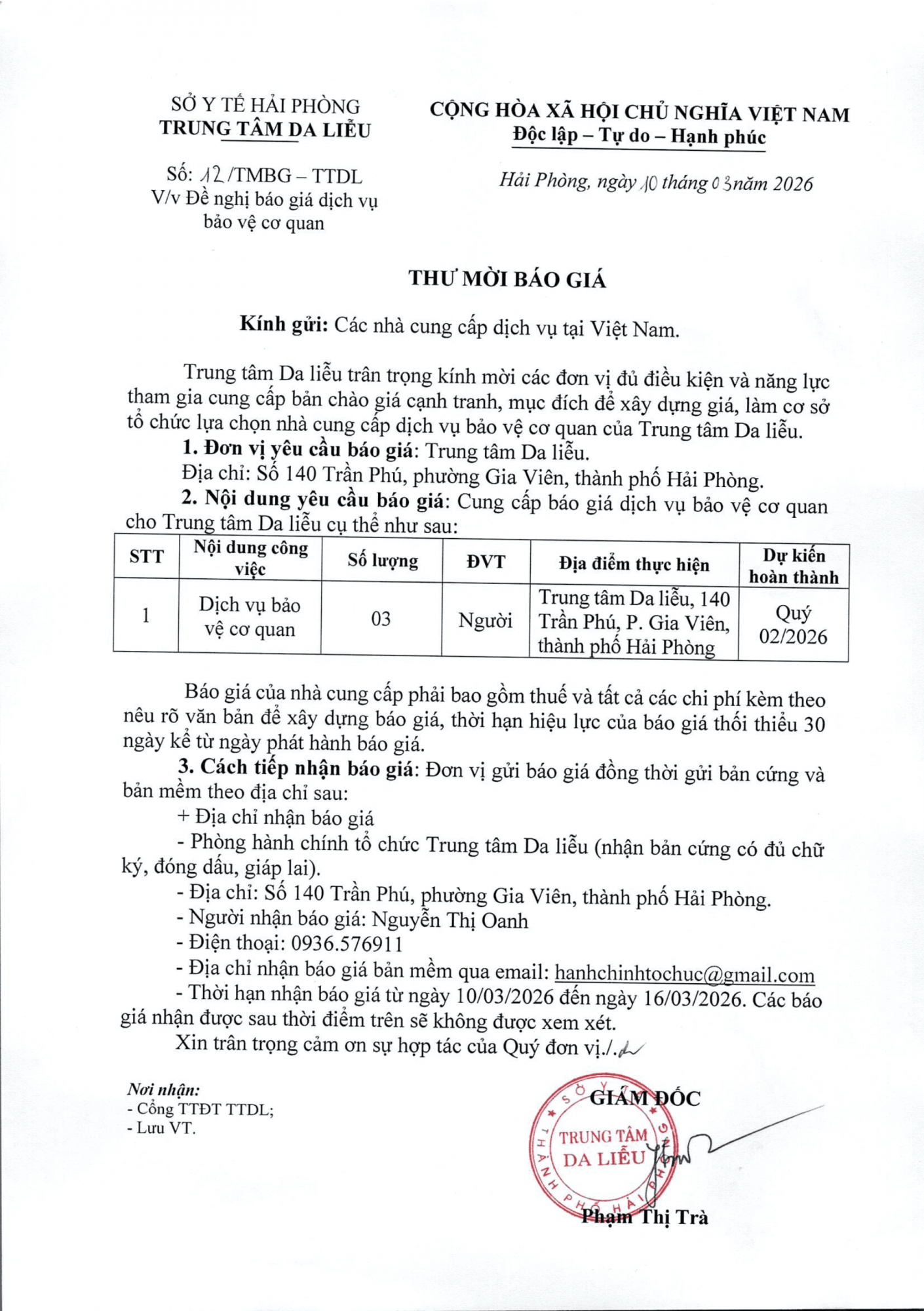 Thứ 3, 10/03/2026 | 08:26 A- A A+ | V/v đề nghị báo giá dịch vụ bảo vệ cơ quan (Quý 2/2026) Đọc bài Lưu Tác giả: BAN BIÊN TẬP Nguồn:Trung tâm da liễu Hải Phòng Copy link Tổng số điểm của bài viết là: 0 trong 0 đánh giá Click để đánh giá bài viết