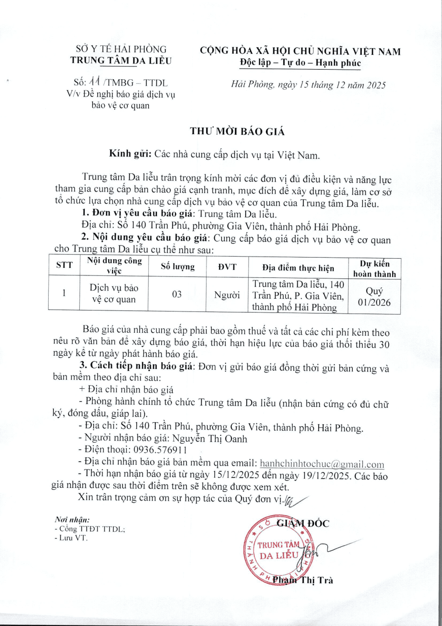 Thứ 2, 15/12/2025 | 09:00 A- A A+ | Đề nghị báo giá dịch vụ bảo vệ cơ quan Quý 1 2026 Đọc bài Lưu Tác giả: BAN BIÊN TẬP Nguồn:Trung tâm da liễu Hải Phòng Copy link Tổng số điểm của bài viết là: 0 trong 0 đánh giá Click để đánh giá bài viết
