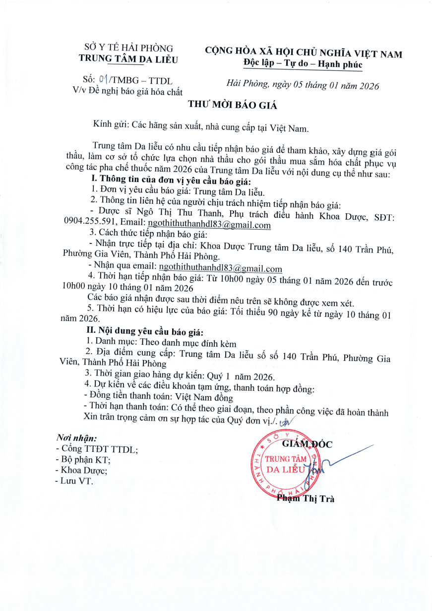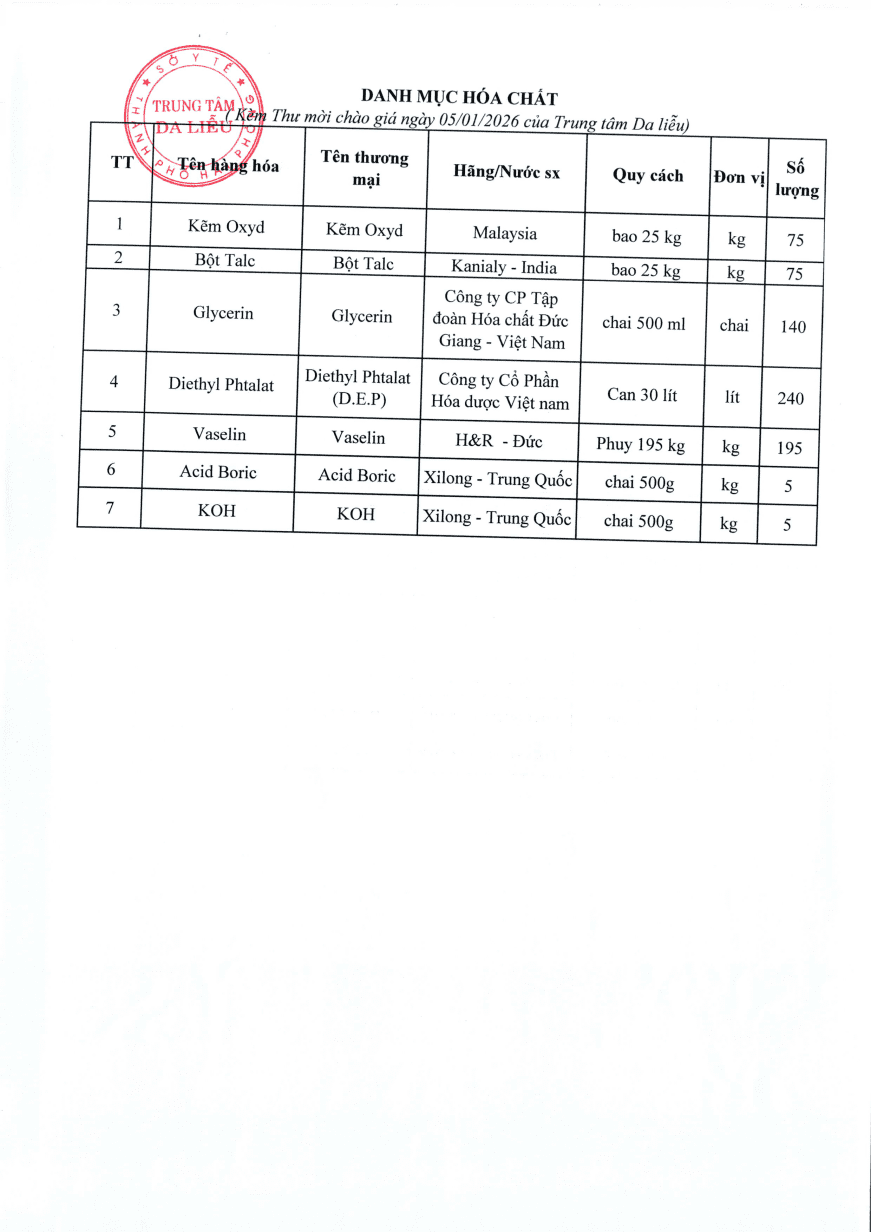 Thứ 2, 05/01/2026 | 14:45 A- A A+ | Đề nghị báo giá hóa chất Đọc bài Lưu Tác giả: BAN BIÊN TẬP Nguồn:Trung tâm da liễu Hải Phòng Copy link Tổng số điểm của bài viết là: 0 trong 0 đánh giá Click để đánh giá bài viết