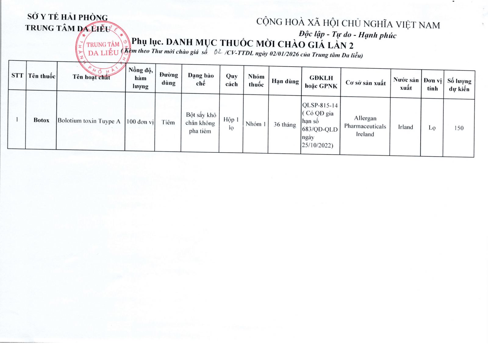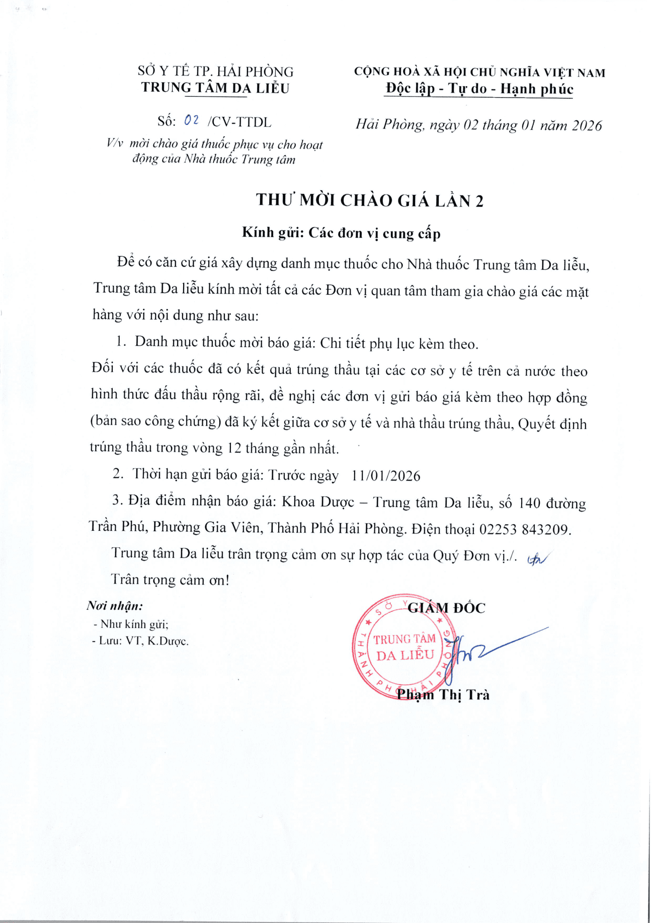 Thứ 6, 02/01/2026 | 13:43 A- A A+ | Mời chào giá thuốc phục vụ cho hoạt động của Nhà thuốc Trung tâm Đọc bài Lưu Tác giả: BAN BIÊN TẬP Nguồn:Trung tâm da liễu Hải Phòng Copy link Tổng số điểm của bài viết là: 0 trong 0 đánh giá Click để đánh giá bài viết