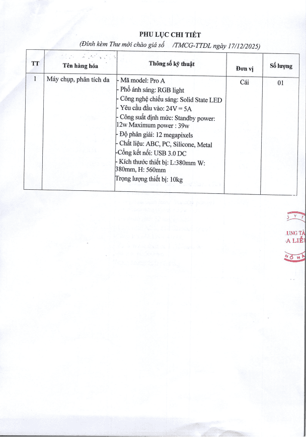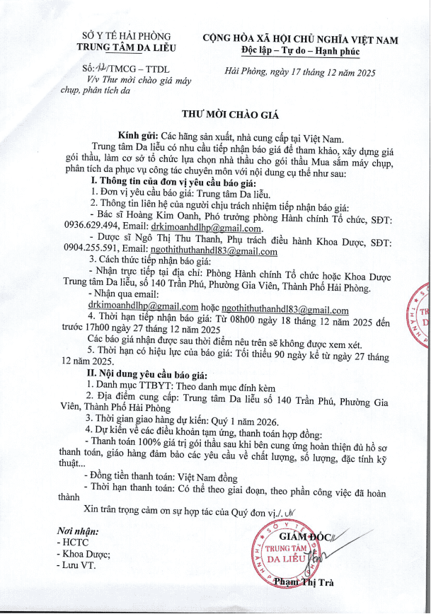 Thứ 4, 17/12/2025 | 13:51 A- A A+ | Thư mời chào giá máy chụp phân tích da Đọc bài Lưu Tác giả: BAN BIÊN TẬP Nguồn:Trung tâm da liễu Hải Phòng Copy link Tổng số điểm của bài viết là: 0 trong 0 đánh giá Click để đánh giá bài viết