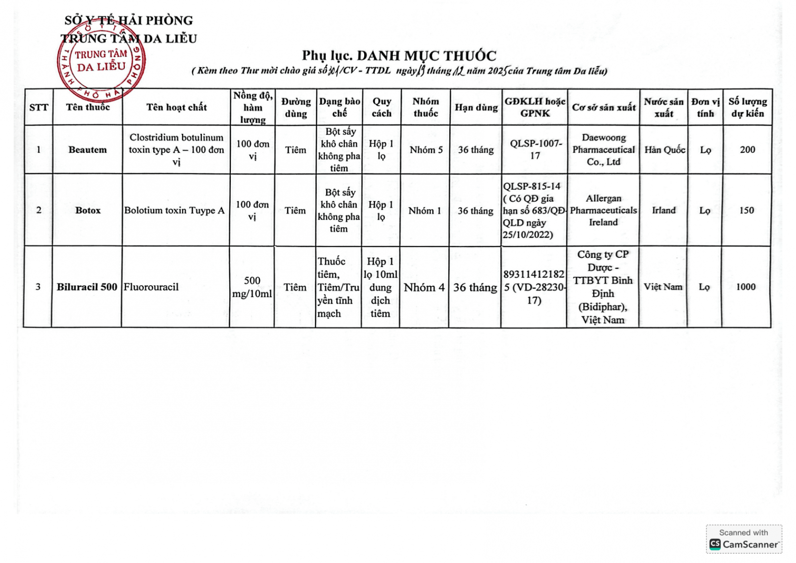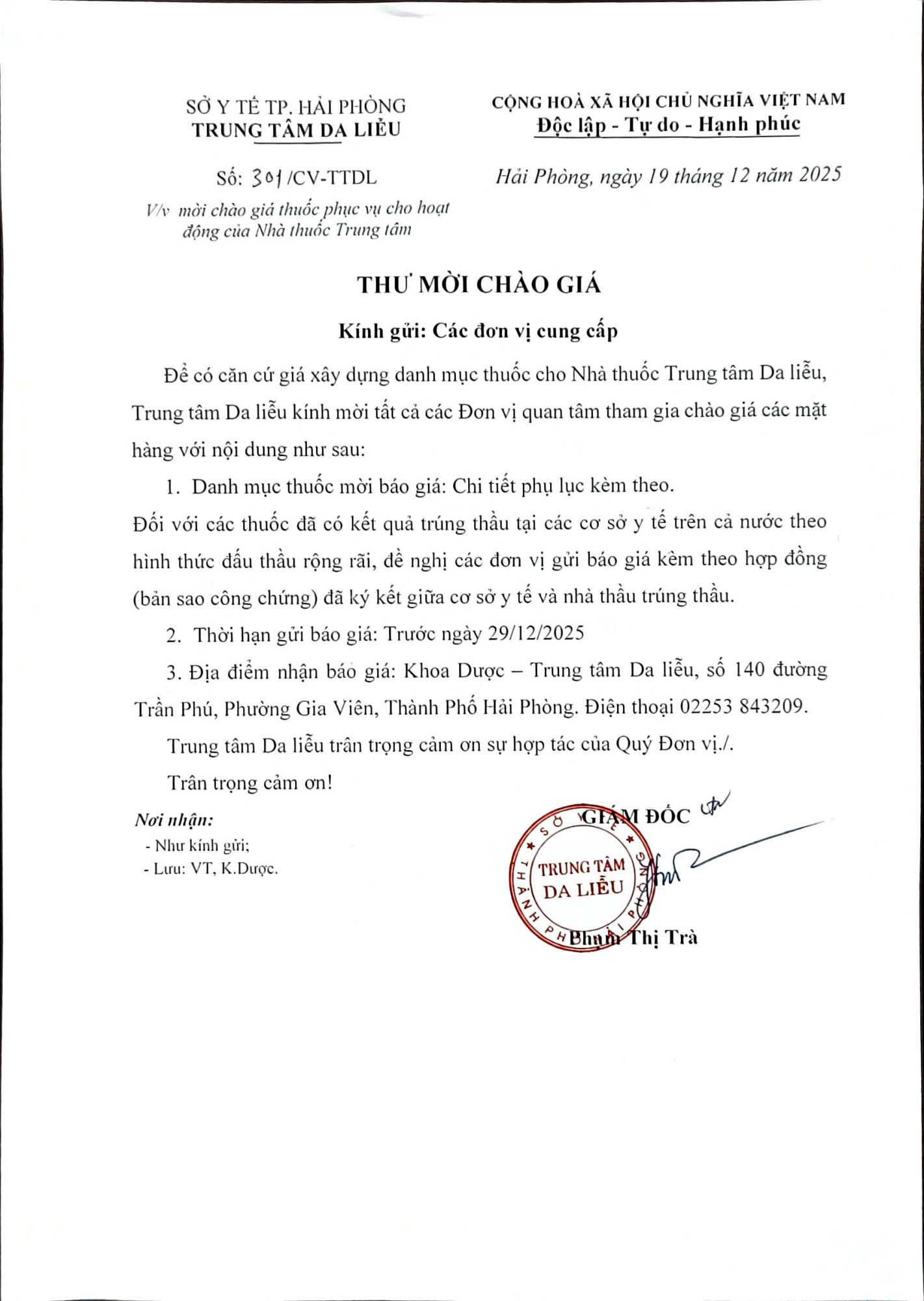 Thứ 6, 19/12/2025 | 11:38 A- A A+ | Thư mời chào giá thuốc phục vụ cho hoạt động của Nhà thuốc Trung tâm Đọc bài Lưu Tác giả: BAN BIÊN TẬP Nguồn:Trung tâm da liễu Hải Phòng Copy link Tổng số điểm của bài viết là: 0 trong 0 đánh giá Click để đánh giá bài viết
