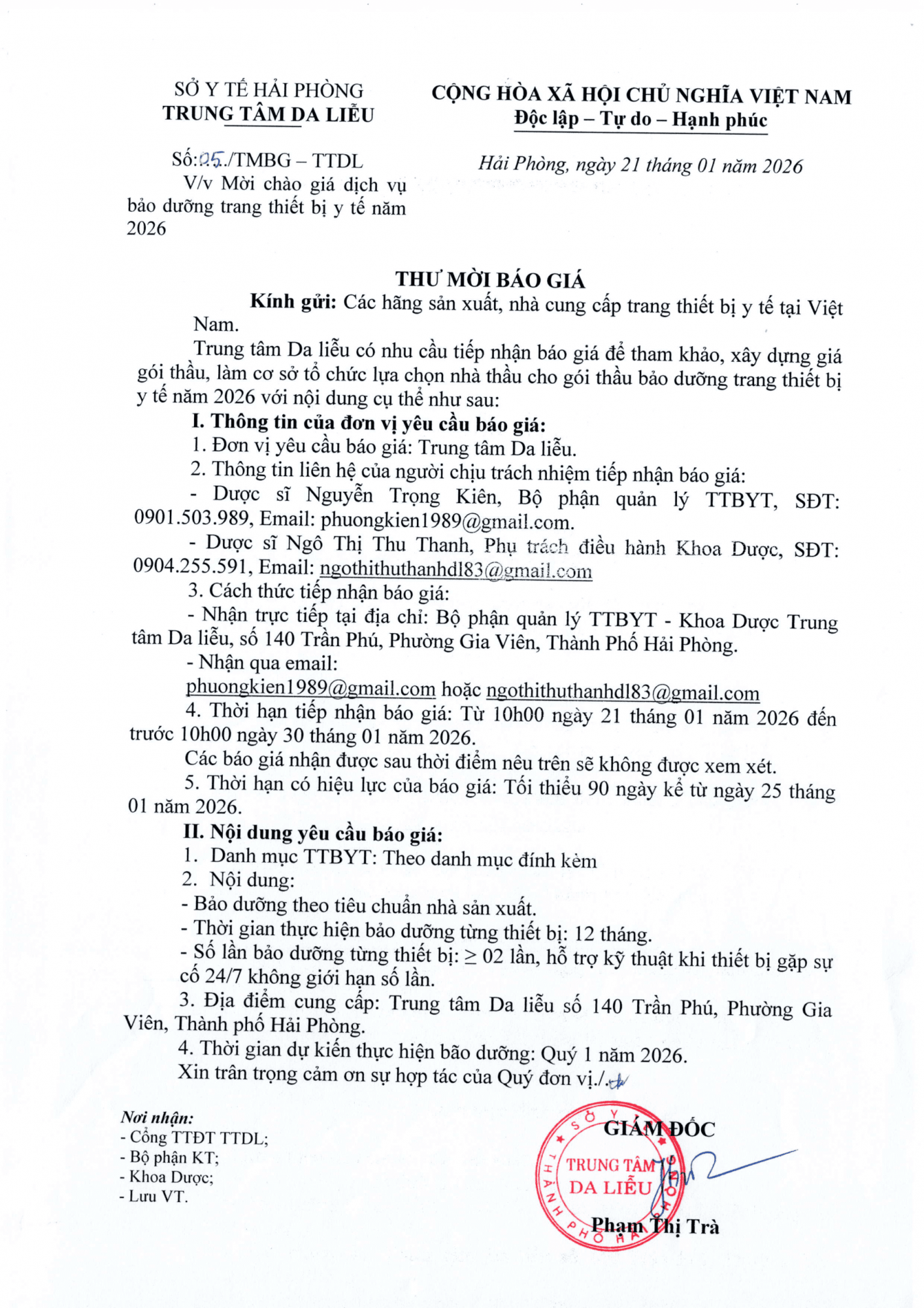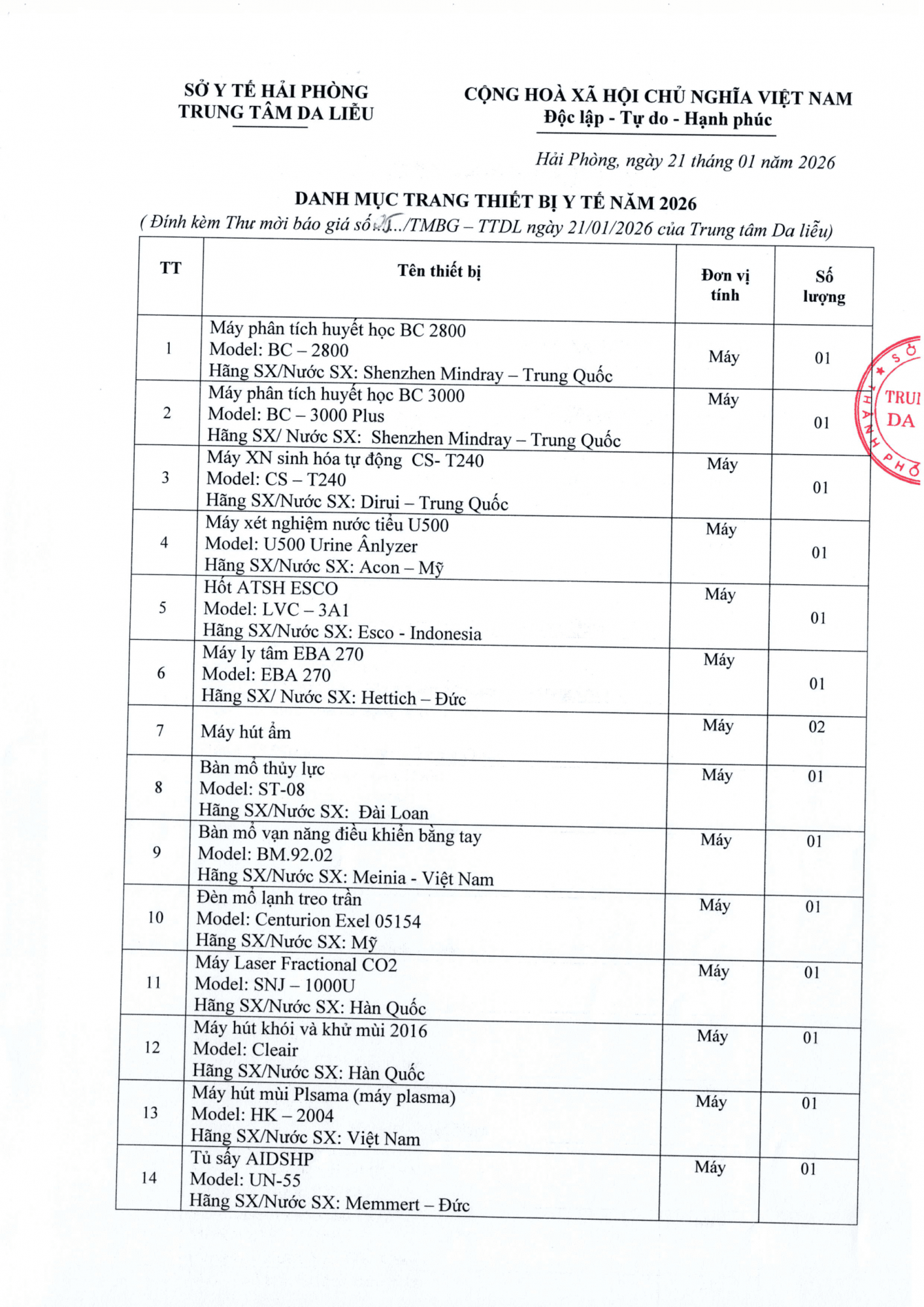 Thứ 4, 21/01/2026 | 14:53 A- A A+ | Về việc mời chào giá dịch vụ bảo dưỡng trang thiết bị y tế năm 2026 Đọc bài Lưu Tác giả: BAN BIÊN TẬP Nguồn:Trung tâm da liễu Hải Phòng Copy link Tổng số điểm của bài viết là: 0 trong 0 đánh giá Click để đánh giá bài viết