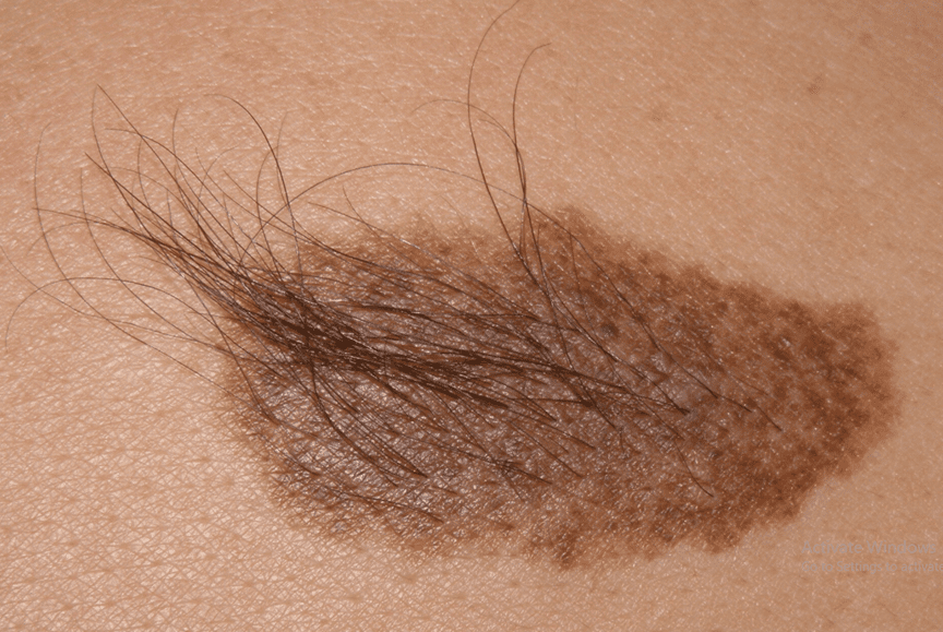 - Sự phát triển của lông (Hypertrichosis): Đây là dấu hiệu đặc trưng. Sau một thời gian da bị sậm màu, tại vị trí đó sẽ mọc lên những sợi lông đen, thô và cứng. Quá trình này có thể mất vài tháng hoặc vài năm để phát triển hoàn thiện.